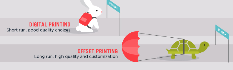 Digital vs Offset. So if the race is short, your quantities small, and you're okay with limited options, Digital is the winner. If you have a larger quantity, need the custom attention and quality of a press, and can plan for 2-3 weeks in production, then Offset, absolutely.Clients are sometimes surprised when we ask about printing and quantities in our very first meeting to design a report or brochure. It almost seems too soon. The reason we do is because the choice between Offset and Digital printing impacts the timing of the project, the cost, as well as the design.